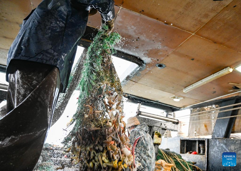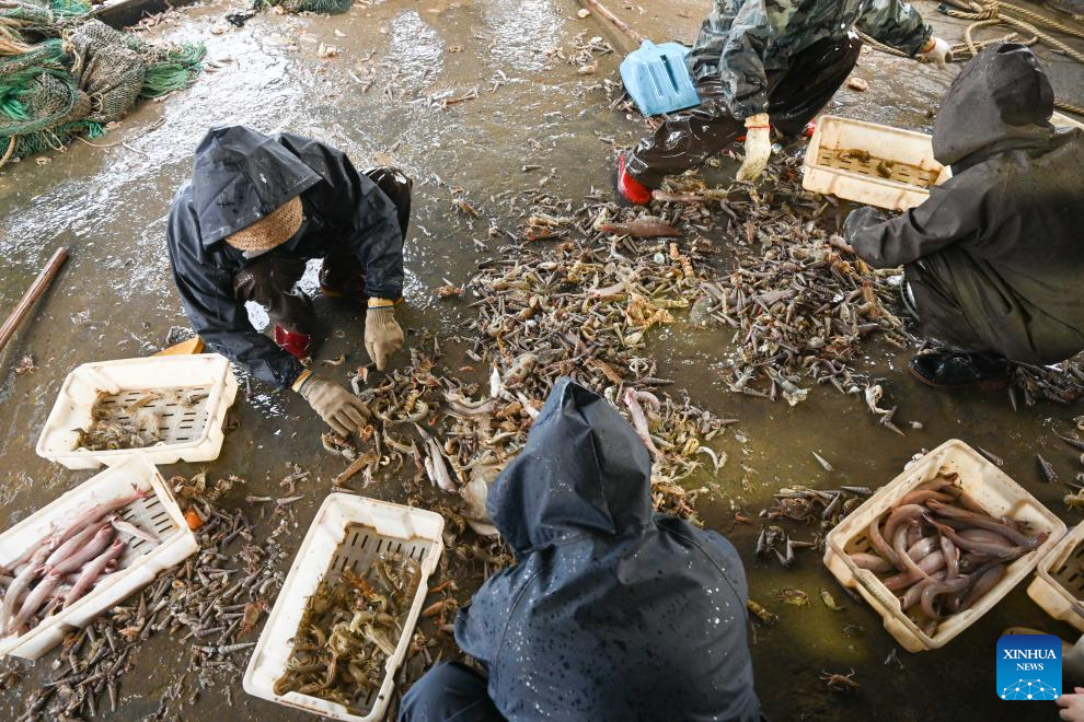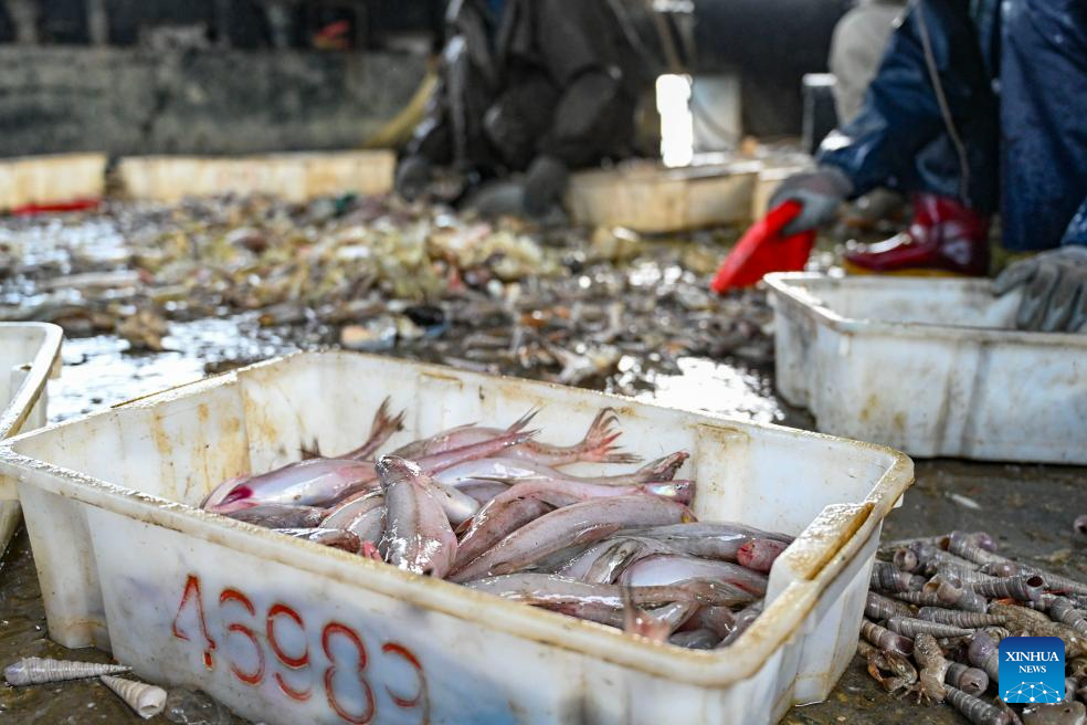 Crew members sort out the catches at the vessel on Jan. 28, 2026. (Xinhua)
