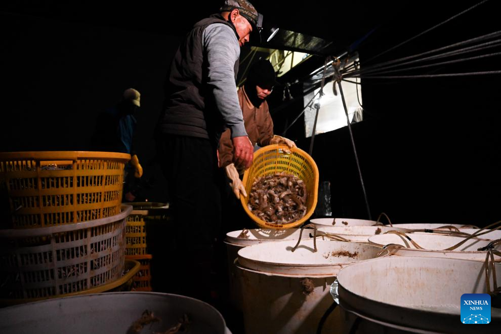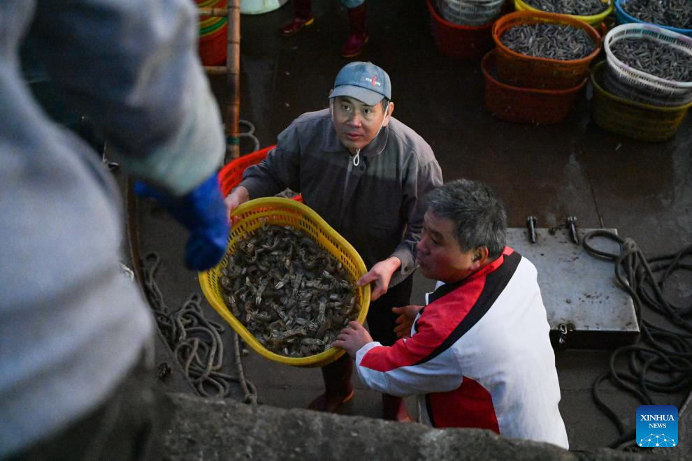 Crew members transfer the catches from a shuttle boat at the Bohe port in Maoming, south China's Guangdong Province, Jan. 29, 2026. (Xinhua)