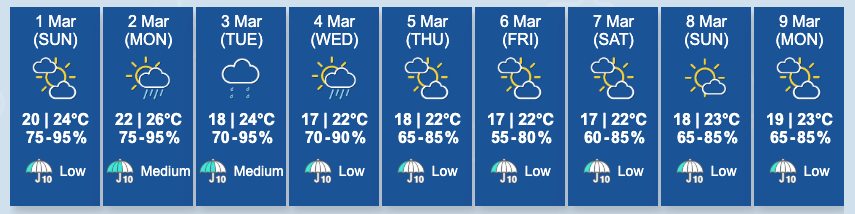 Meanwhile, a strong easterly airstream will affect the coast of Guangdong. With the easterly airstream being replaced by a humid southerly airstream, it will be warm during the day with coastal fog in the morning and at night over southern China tomorrow and on Monday (March 1).