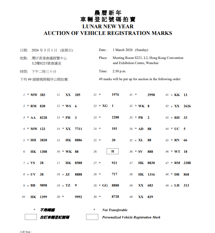 The Transport Department held the Lunar New Year license plate auction yesterday (March 1), offering 49 license plate numbers for public bidding. The only custom license plate, "H," drew intense bidding after several rounds, ultimately selling for HK$20 million, making it the fourth highest price ever; another highly anticipated license plate, the traditional plate "30" sold for HK$4.55 million.