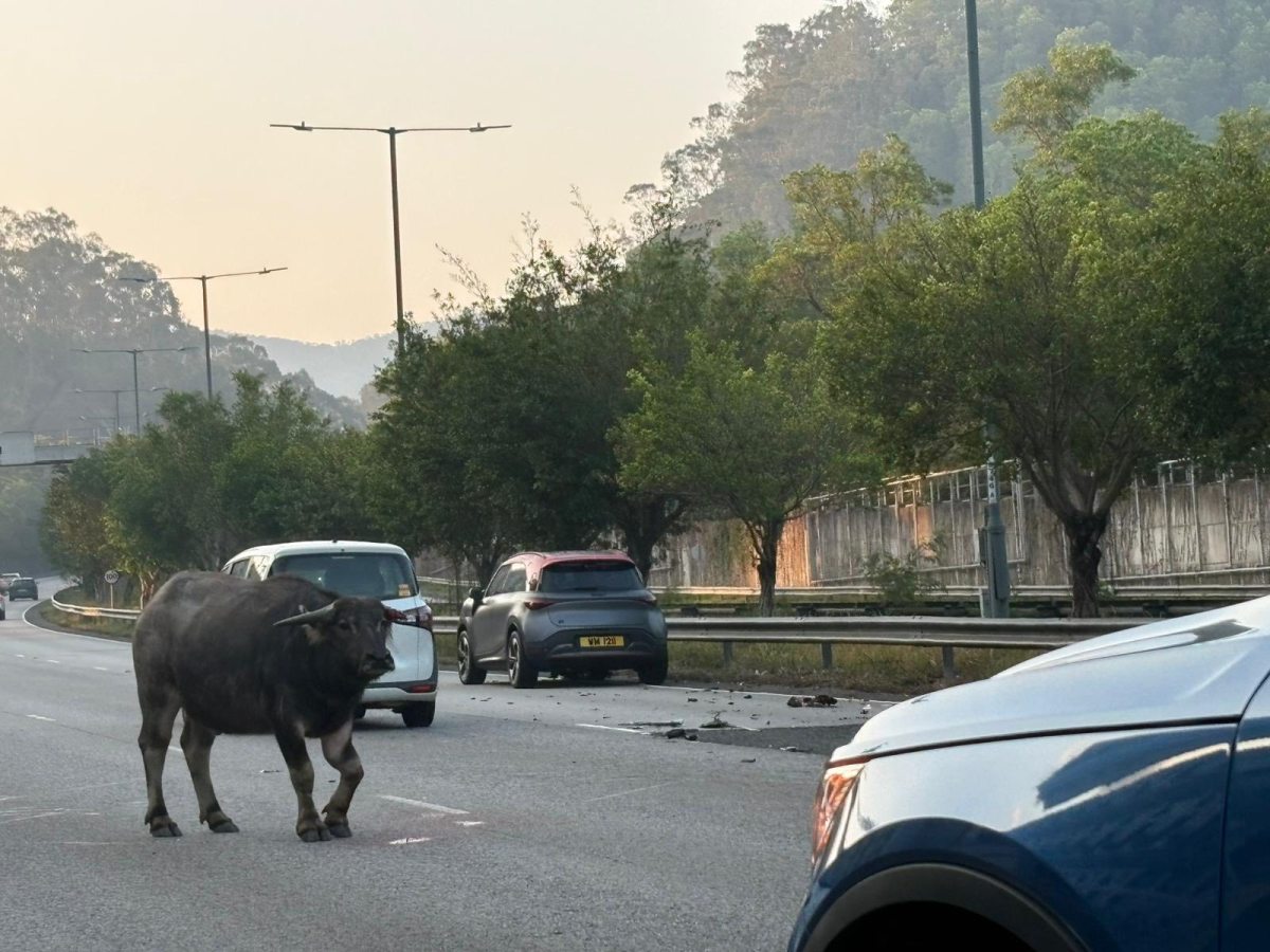 A rare traffic accident occurred this morning (March 18) on Tsing Long Highway. A private car traveling on the fast lane near Tai Lam Tunnel struck a water buffalo that had walked out from roadside vegetation. The driver could not brake in time; the car's front end was wrecked, parts were scattered across the road, and the buffalo was injured and collapsed, leaving bloodstains on the roadway.