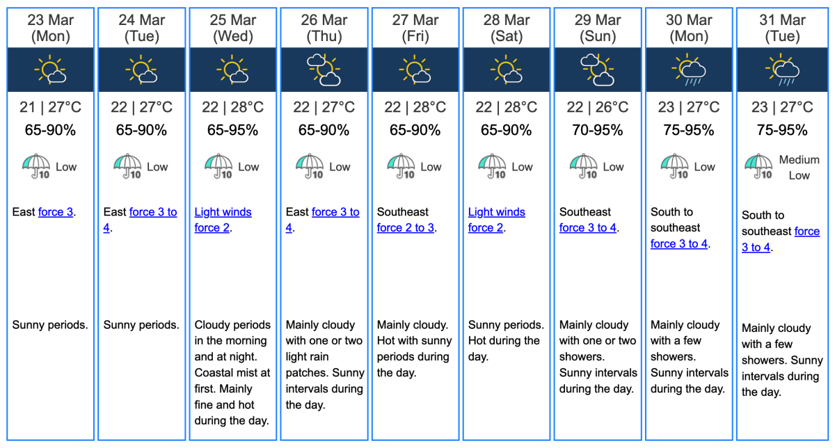 According to the Observatory’s nine‑day forecast, parts of the daytime on the next two days (March 23 and 24) will be sunny, with temperatures ranging from 21°C to 27°C; some parts of Sheung Shui could reach a high of 30°C. On Wednesday (March 25) it will be partly cloudy at times in the mornings and evenings, with early coastal fog in places; daytime conditions will be generally fine and hot. The Observatory’s automatic district forecasts also show that areas including Sheung Shui, Ta Kwu Ling and Kam Tin could see highs of 30°C or above.