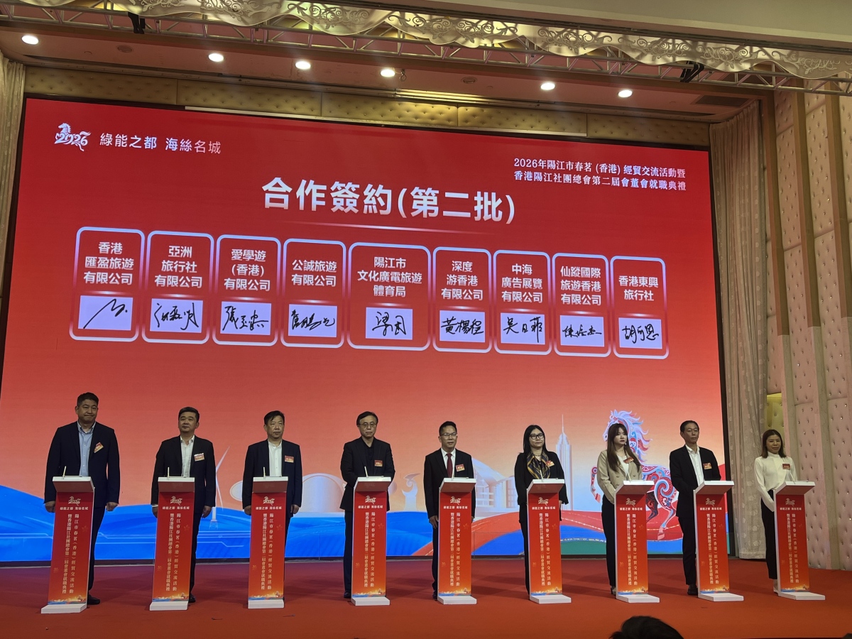 Zheng Weizhen, Vice Mayor of Yangjiang, delivered a special presentation on Yangjiang's investment environment and cultural tourism industry at the event. During the ceremony, the Yangjiang Municipal Bureau of Culture, Radio, Television, Tourism and Sports signed cooperation agreements with the Hong Kong Cultural Tourism Association and relevant travel agencies to deepen collaboration in the tourism sector. Latest figures show that Yangjiang received nearly 300,000 tourists from Hong Kong and Macao last year, representing an increase of more than 50 per cent year on year, following a doubling of arrivals in the previous year.