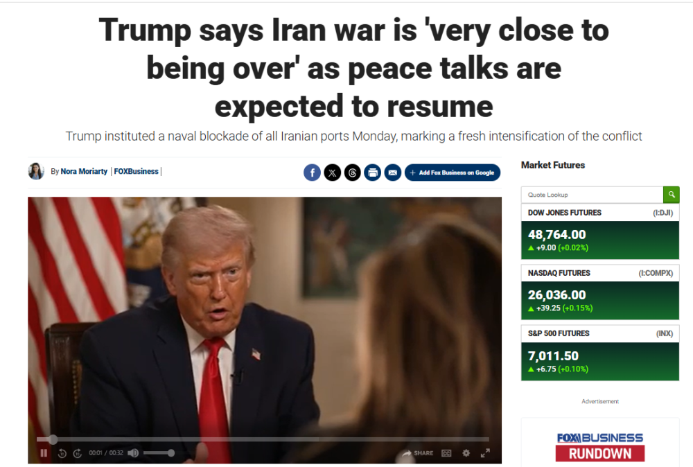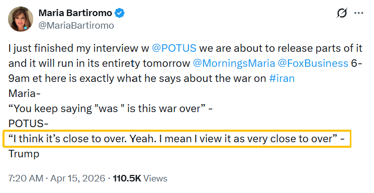 US President Donald Trump told Fox News on April 14 that the war with Iran is nearing its end. In an interview with Fox Business Network's Maria Bartiromo set to air Wednesday on "Mornings with Maria," Trump was pressed on the status of the Iran conflict. When asked directly whether the war had ended, Trump signaled that it was nearing its conclusion. "I think it's close to over, yeah," he said. "I view it as very close to being over," Trump added.