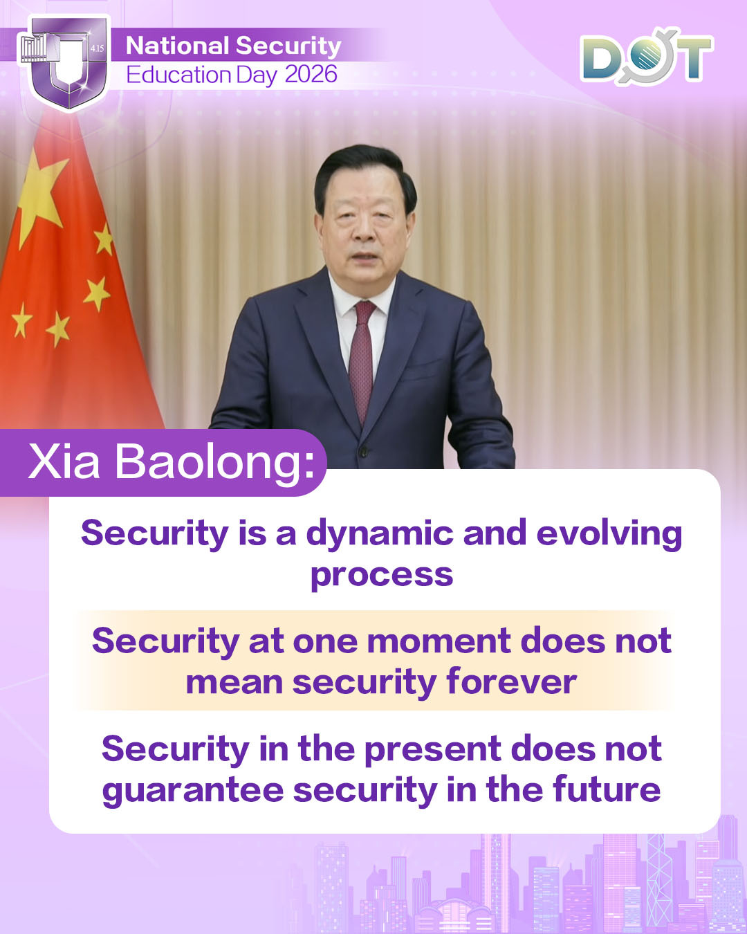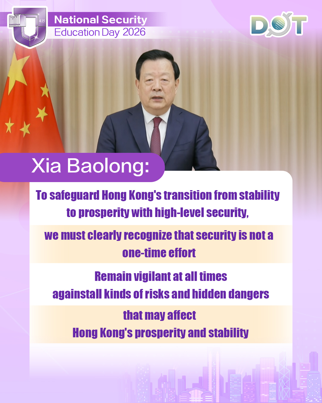 Xia Baolong stated that to safeguard Hong Kong's transition from stability to prosperity with high-level security, it is necessary to clearly recognize that security is not a one-time effort. He said that we must remain vigilant at all times against various risks and hidden dangers that could affect Hong Kong's prosperity and stability. Security is a dynamic and evolving process; security at one moment does not mean security forever, and security in the present does not guarantee security in the future. The State Council Information Office released the White Paper titled "Hong Kong: Safeguarding China's National Security on February 10 this year, comprehensively reviewing the practical journey of Hong Kong in safeguarding national security and deeply analyzing the situation and tasks of safeguarding national security in Hong Kong. This serves as a reminder for everyone to be vigilant in times of peace.