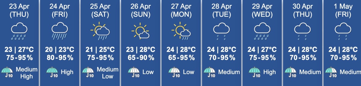 By Friday (April 24), rainfall is expected to intensify in some areas, with the minimum temperature falling to around 21°C.
